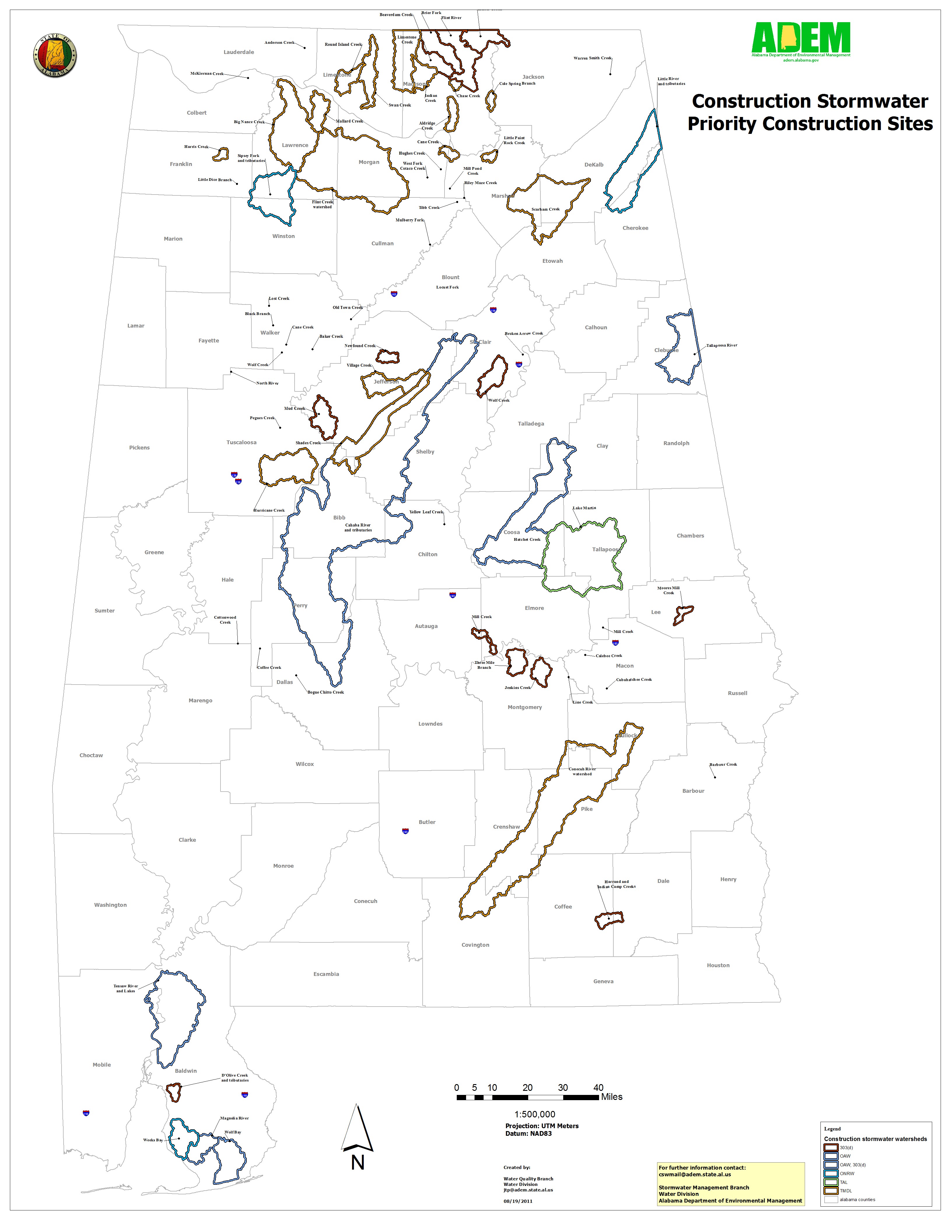 Description: Watersheds were created using the 12 digit Watershed Database (WDB) developed by NRCS. The subwatersheds around waterbody segments which fall into the folloing categories we extracted and edited to fit the areas listed. The categories are:Classified Outstanding Alabama Watersdesignated as an Outstanding Natural Resource Water (ONRW) or Treasured Alabama Lake (TAL)In catgeory 4A with a Total Maximum Daily Load (TMDL) calculated involving siltation,Listed on the 303(d) list for siltation.